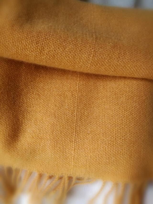 シンプルでありながら透かしたときに分かる程度の霞のような柄織り、長めのフリンジもアクセントです。